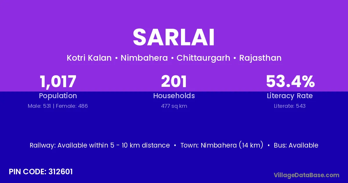 Nimbahera (14 km) is the nearest town to Sarlai village for major economic activities and is located approximately 14 km away.