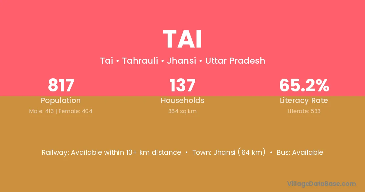 The literacy rate of Tai village is 60.19%. Male literacy stands at 73.62% and female literacy at 46.48%.