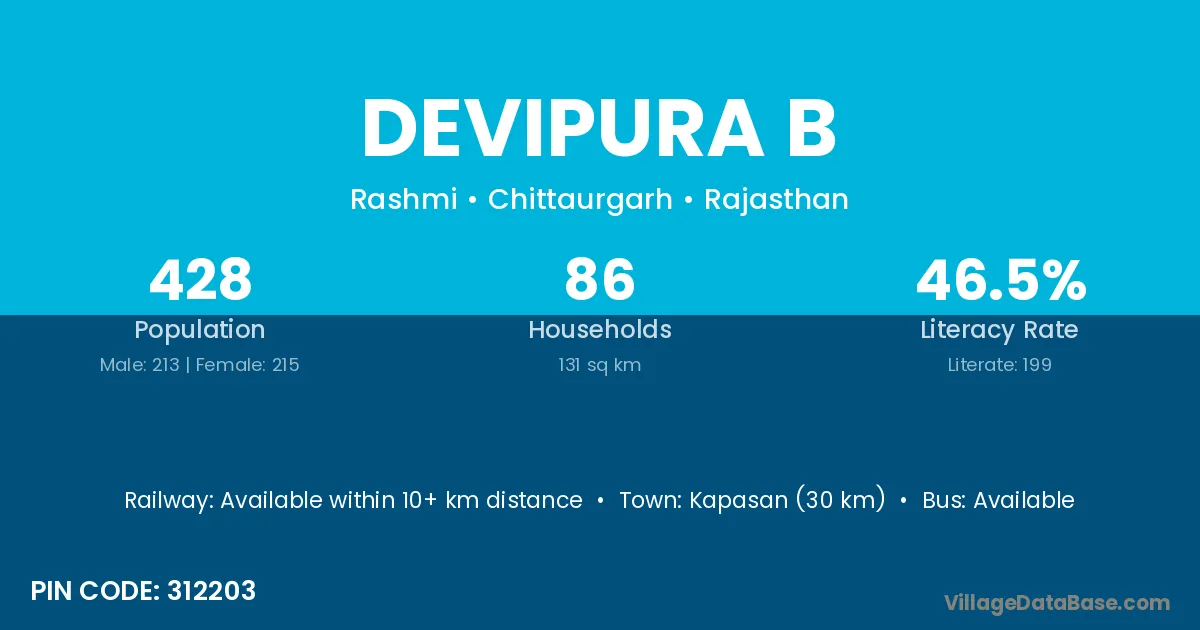 Devipura B village has a total population of 428 people, of which 213 are males and 215 are females.