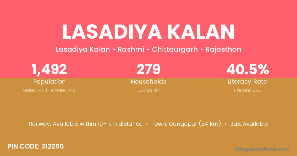 Lasadiya Kalan village has a total population of 1,492 people, of which 744 are males and 748 are females.