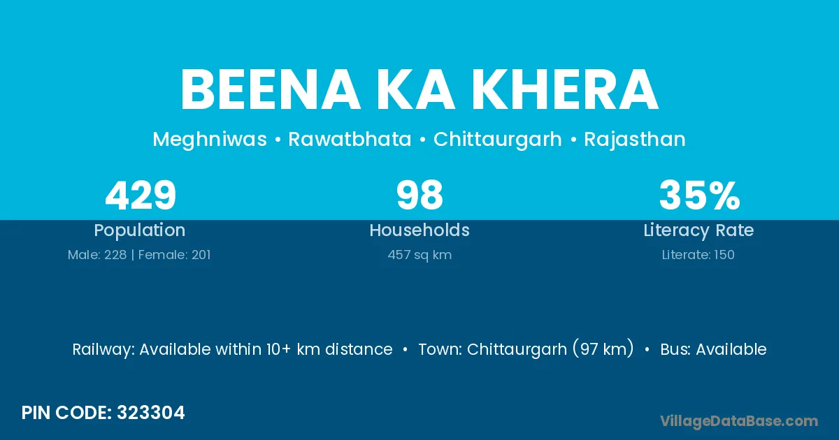 Chittaurgarh (97 km) is the nearest town to Beena Ka Khera village for major economic activities and is located approximately 97 km away.