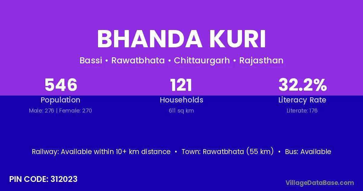 Rawatbhata (55 km) is the nearest town to Bhanda Kuri village for major economic activities and is located approximately 55 km away.
