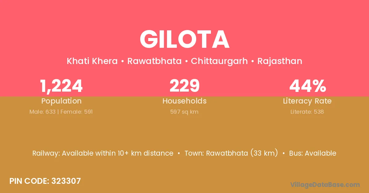 Rawatbhata (33 km) is the nearest town to Gilota village for major economic activities and is located approximately 33 km away.