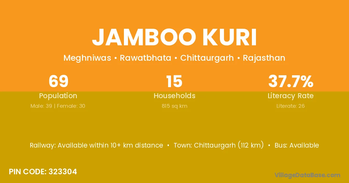 Chittaurgarh (112 km) is the nearest town to Jamboo Kuri village for major economic activities and is located approximately 112 km away.