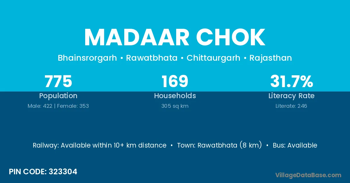 Rawatbhata (8 km) is the nearest town to Madaar Chok village for major economic activities and is located approximately 8 km away.