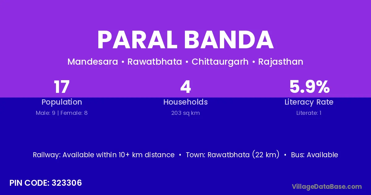 Rawatbhata (22 km) is the nearest town to Paral Banda village for major economic activities and is located approximately 22 km away.