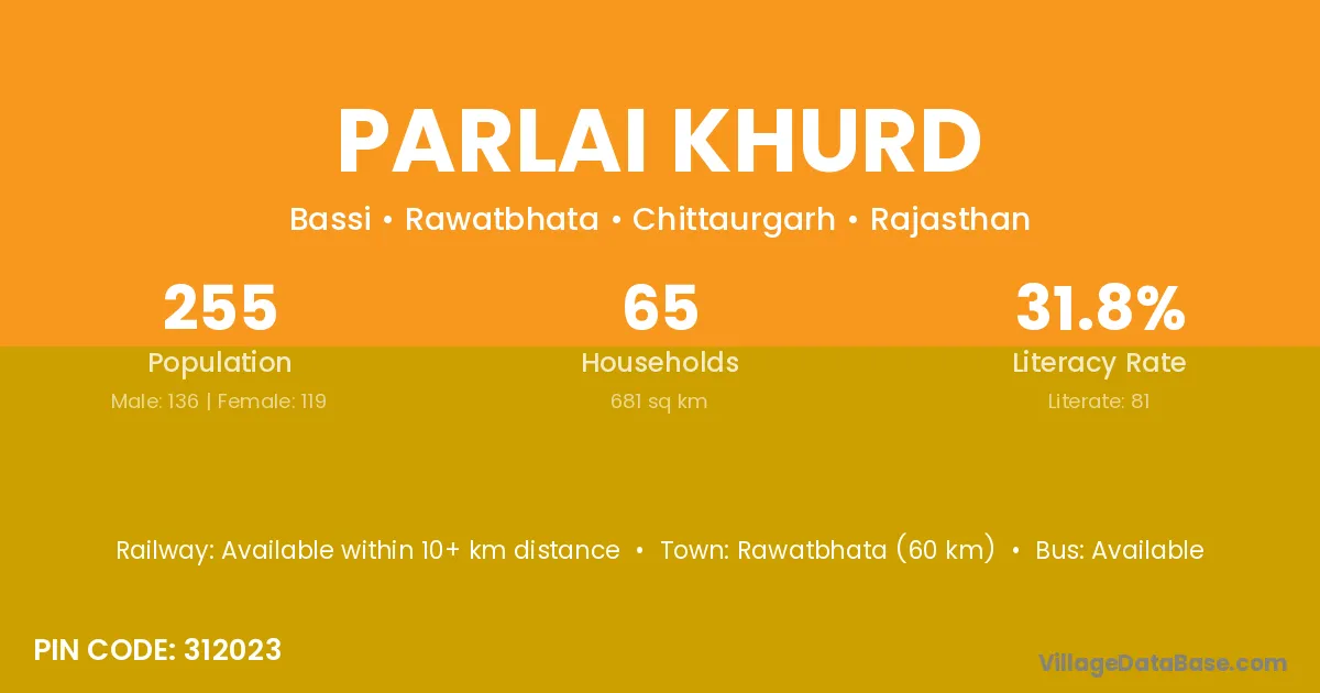 Rawatbhata (60 km) is the nearest town to Parlai Khurd village for major economic activities and is located approximately 60 km away.