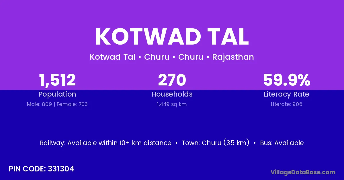 Churu (35 km) is the nearest town to Kotwad Tal village for major economic activities and is located approximately 35 km away.