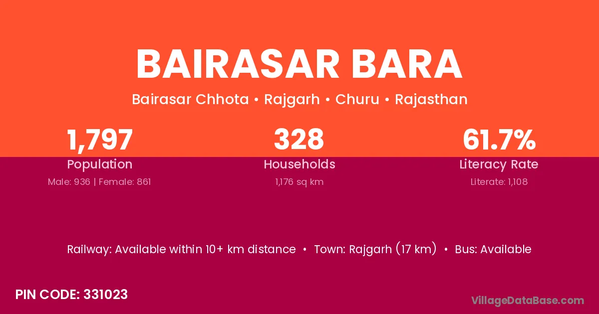 Rajgarh (17 km) is the nearest town to Bairasar Bara village for major economic activities and is located approximately 17 km away.