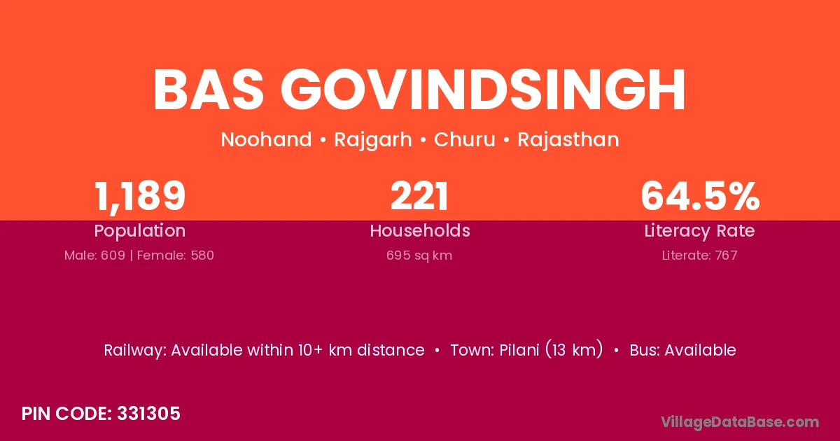 Pilani (13 km) is the nearest town to Bas Govindsingh village for major economic activities and is located approximately 13 km away.