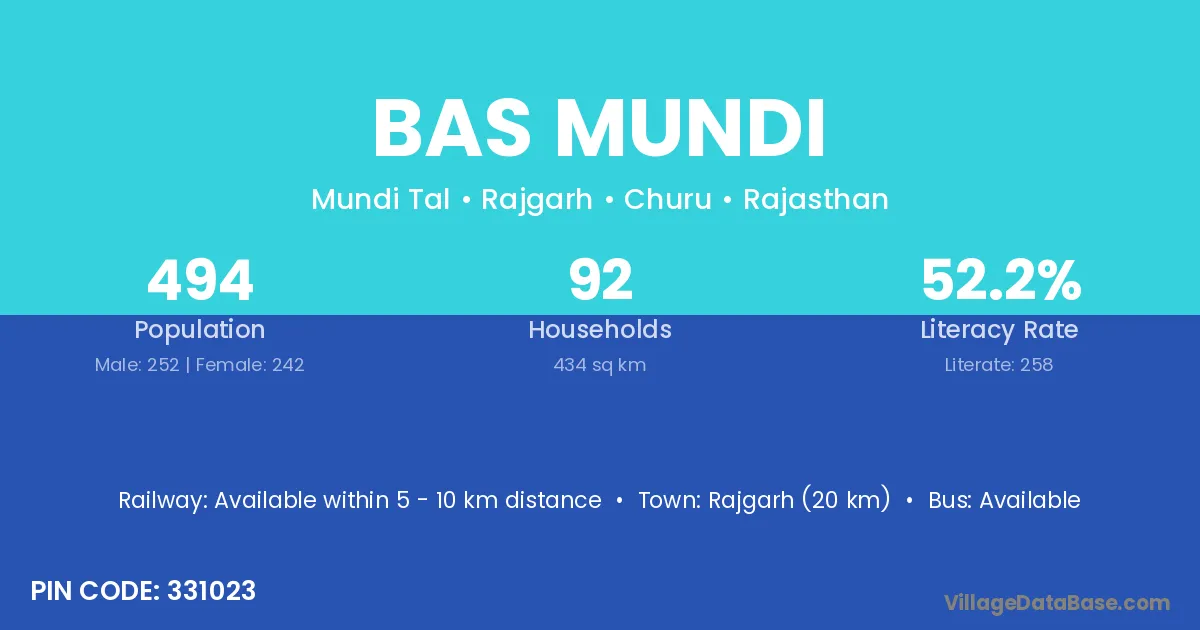 Rajgarh (20 km) is the nearest town to Bas Mundi village for major economic activities and is located approximately 20 km away.