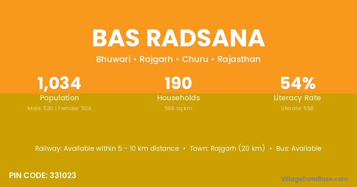 Rajgarh (20 km) is the nearest town to Bas Radsana village for major economic activities and is located approximately 20 km away.