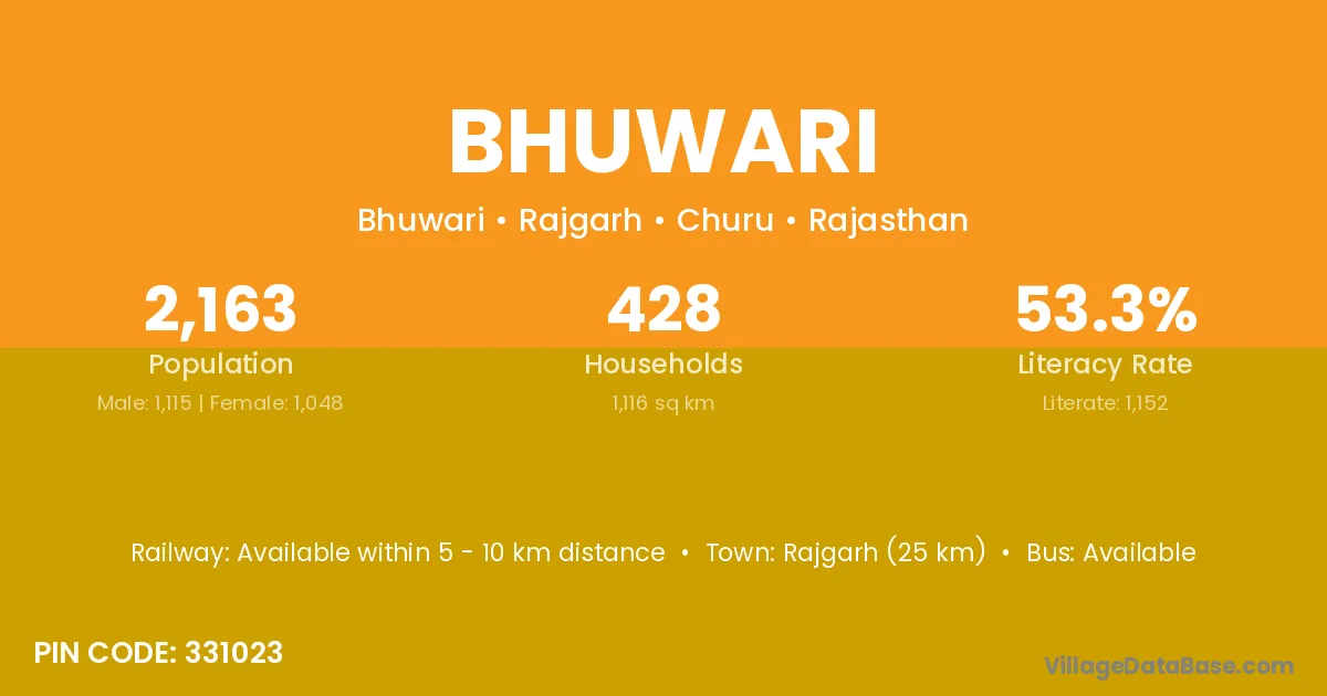 Rajgarh (25 km) is the nearest town to Bhuwari village for major economic activities and is located approximately 25 km away.