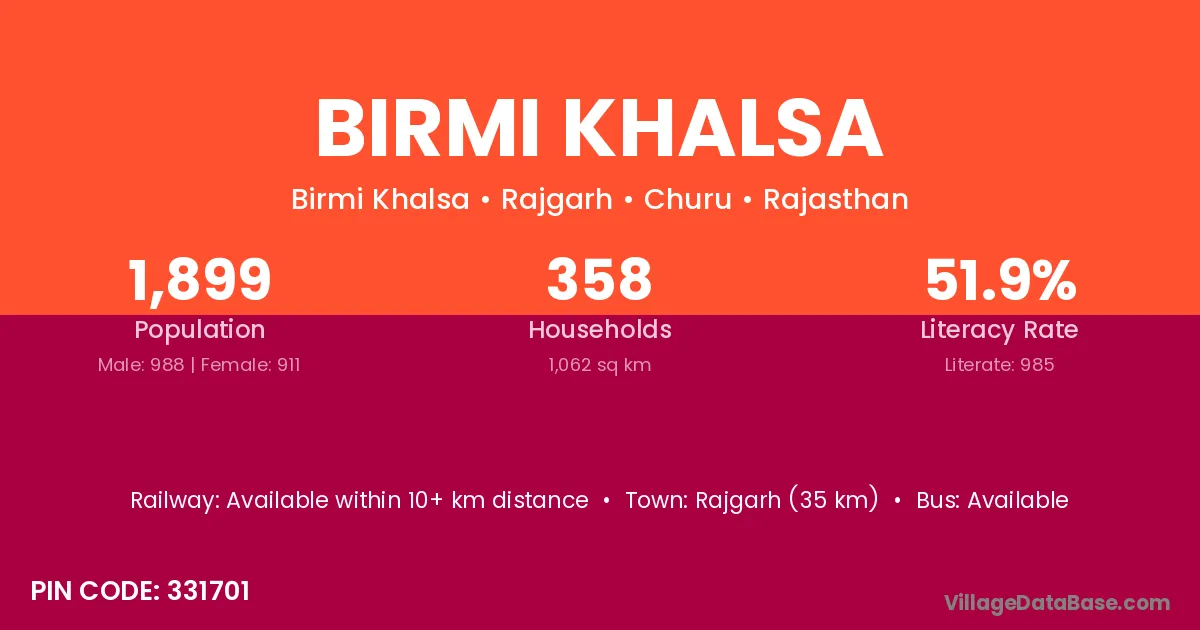Rajgarh (35 km) is the nearest town to Birmi Khalsa village for major economic activities and is located approximately 35 km away.