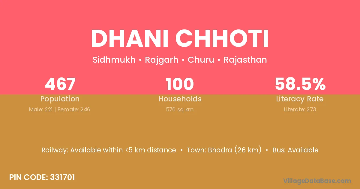 Dhani Chhoti village has a total population of 467 people, of which 221 are males and 246 are females.