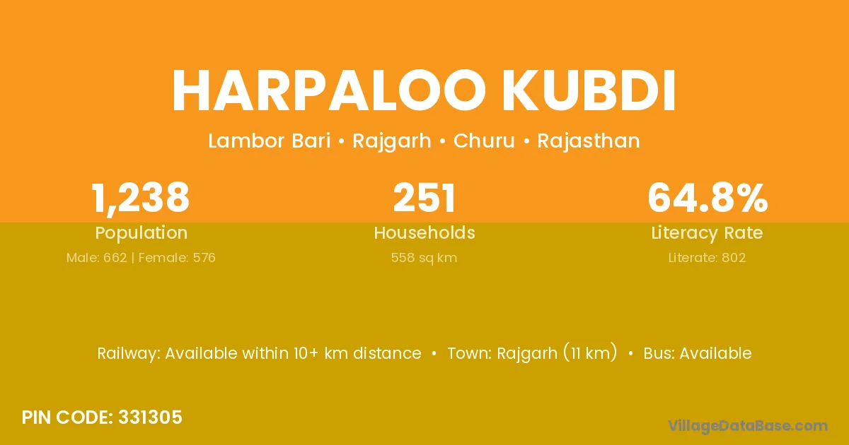 Rajgarh (11 km) is the nearest town to Harpaloo Kubdi village for major economic activities and is located approximately 11 km away.