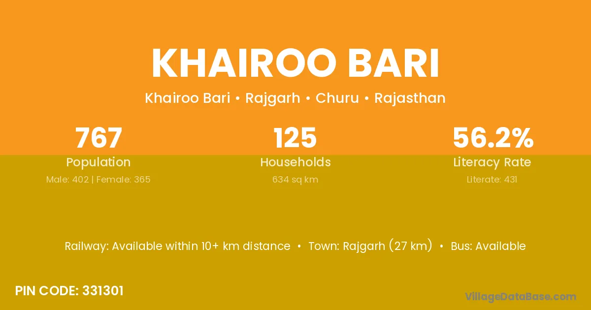 Rajgarh (27 km) is the nearest town to Khairoo Bari village for major economic activities and is located approximately 27 km away.