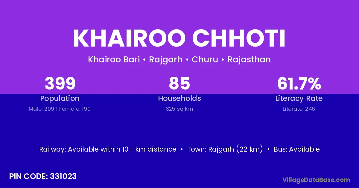 Rajgarh (22 km) is the nearest town to Khairoo Chhoti village for major economic activities and is located approximately 22 km away.