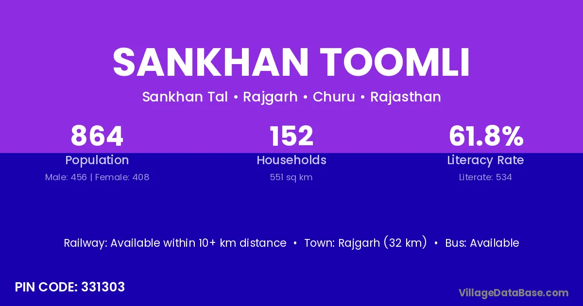 According to Census 2011 information, the village code of Sankhan Toomli village is 331303.