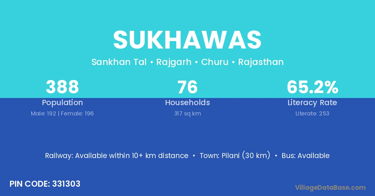 Pilani (30 km) is the nearest town to Sukhawas village for major economic activities and is located approximately 30 km away.