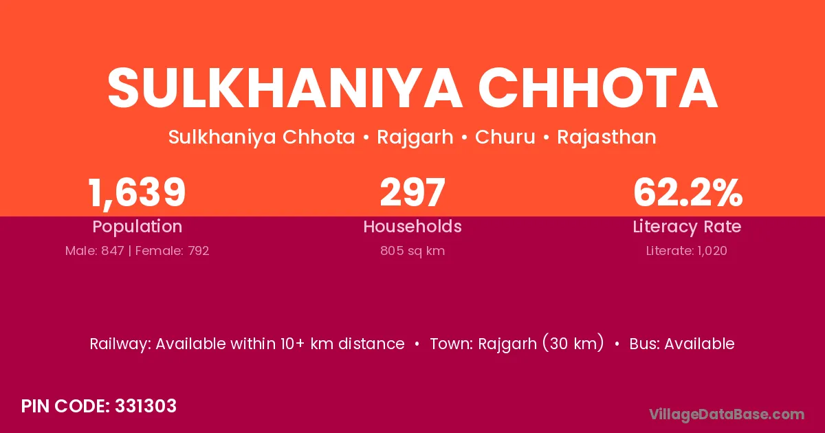 Rajgarh (30 km) is the nearest town to Sulkhaniya Chhota village for major economic activities and is located approximately 30 km away.