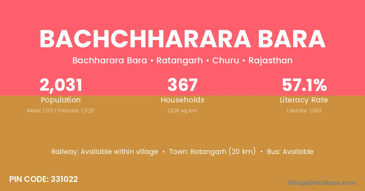 Bachchharara Bara village has a total population of 2,031 people, of which 1,011 are males and 1,020 are females.