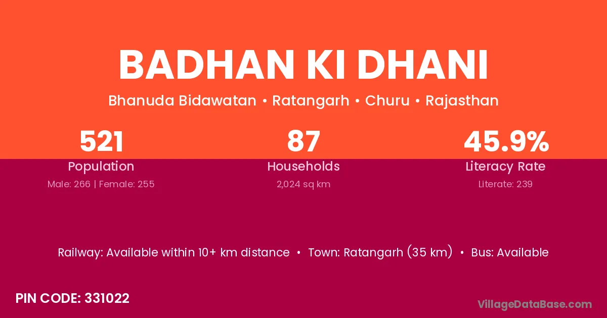 Badhan Ki Dhani village has a total population of 521 people, of which 266 are males and 255 are females.