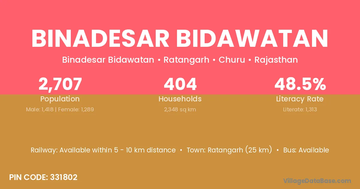 Ratangarh (25 km) is the nearest town to Binadesar Bidawatan village for major economic activities and is located approximately 25 km away.
