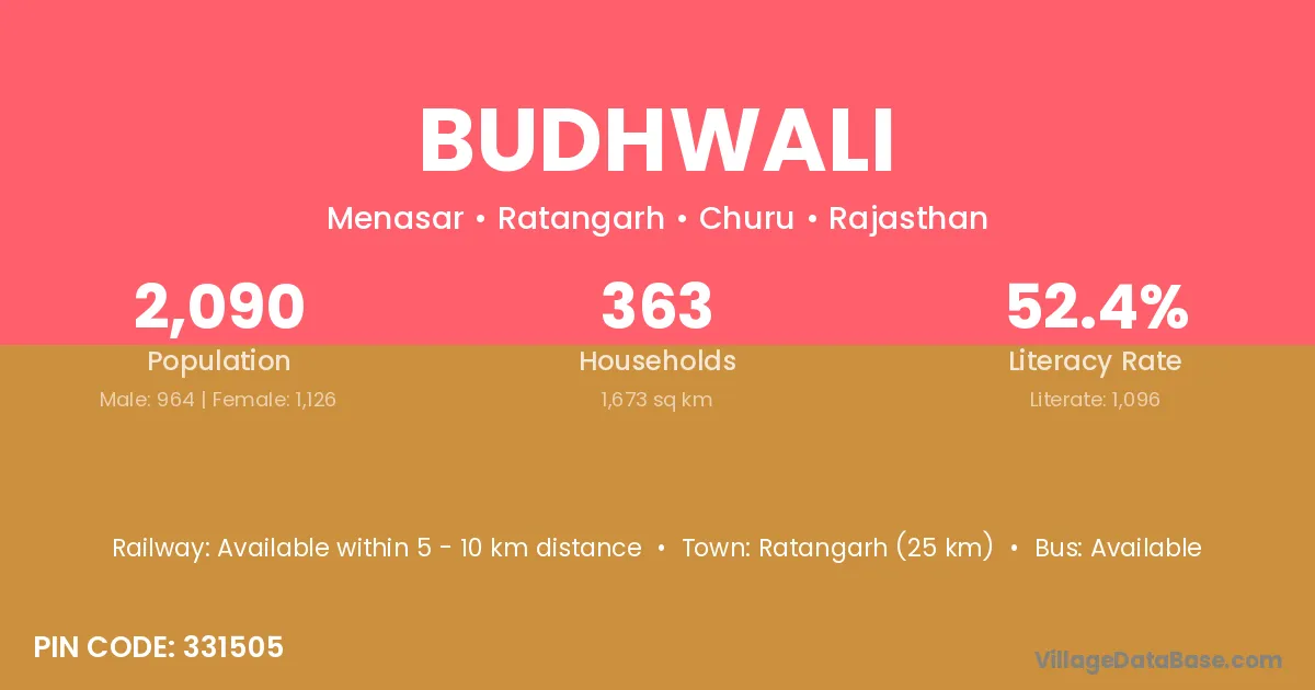 Ratangarh (25 km) is the nearest town to Budhwali village for major economic activities and is located approximately 25 km away.