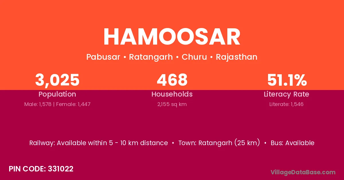 Ratangarh (25 km) is the nearest town to Hamoosar village for major economic activities and is located approximately 25 km away.