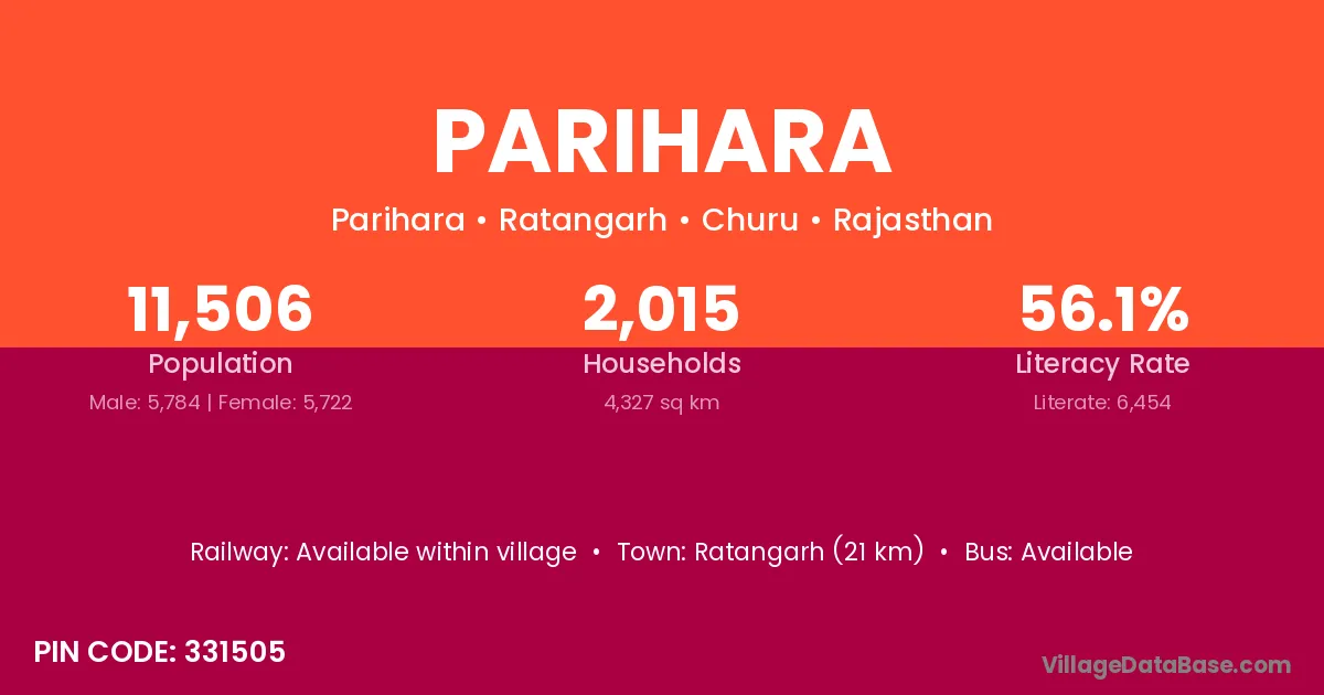 Parihara village has a total population of 11,506 people, of which 5,784 are males and 5,722 are females.