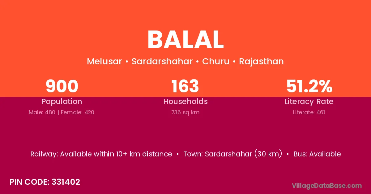 Sardarshahar (30 km) is the nearest town to Balal village for major economic activities and is located approximately 30 km away.