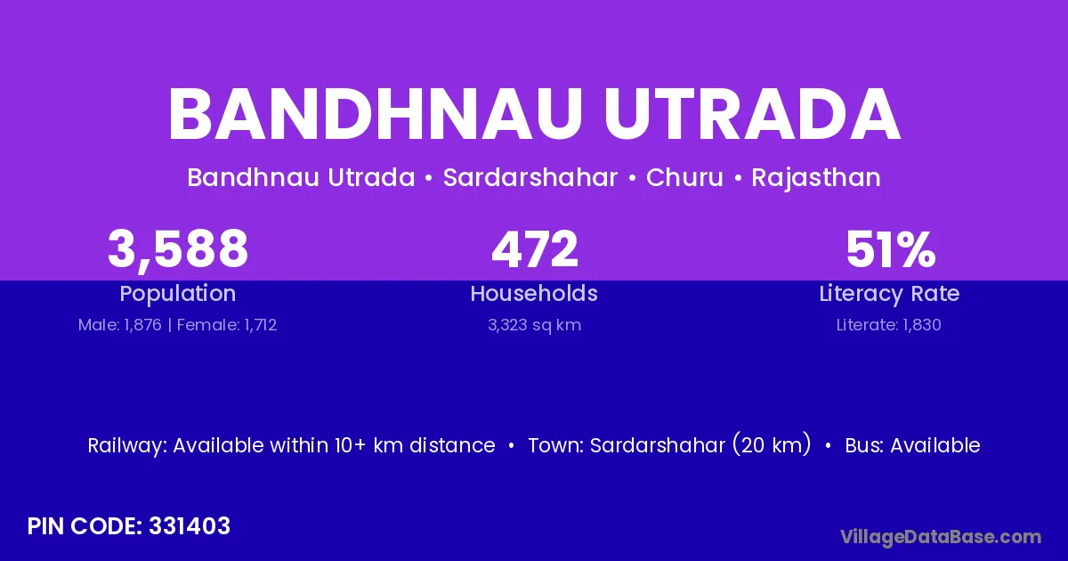 Sardarshahar (20 km) is the nearest town to Bandhnau Utrada village for major economic activities and is located approximately 20 km away.