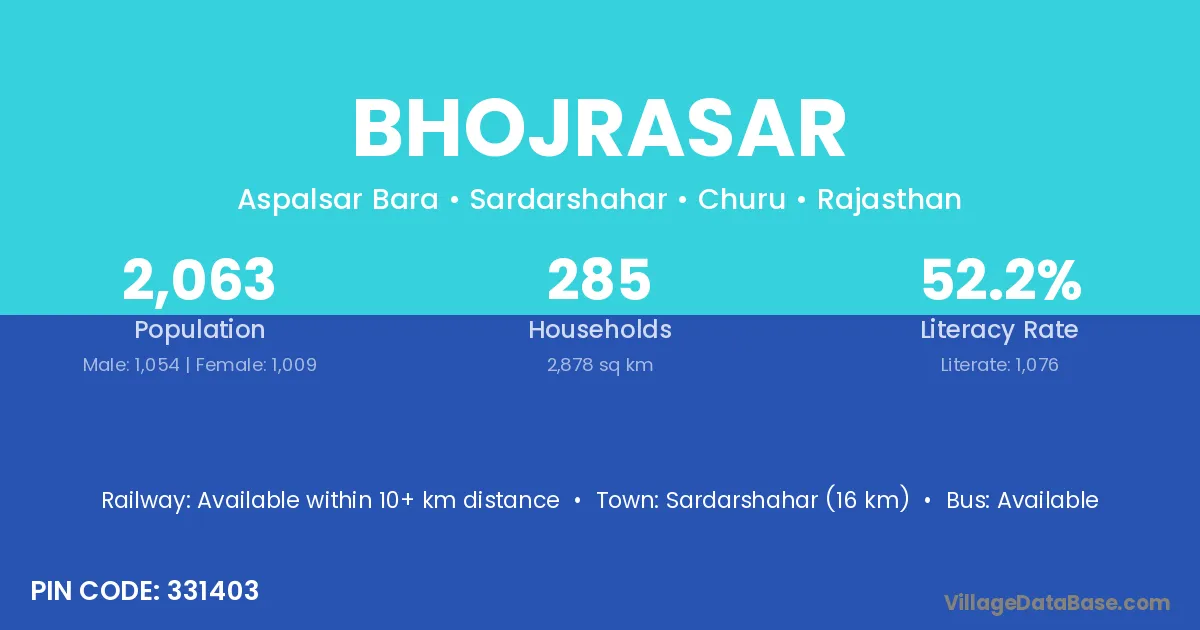 Sardarshahar (16 km) is the nearest town to Bhojrasar village for major economic activities and is located approximately 16 km away.
