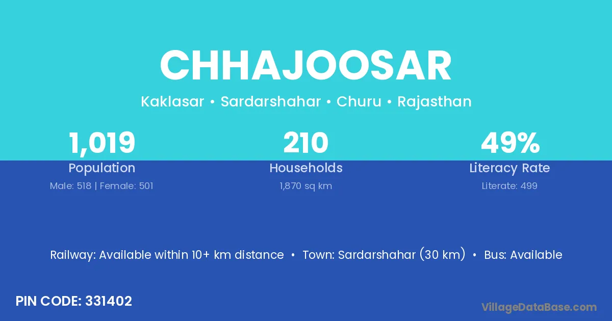 Sardarshahar (30 km) is the nearest town to Chhajoosar village for major economic activities and is located approximately 30 km away.
