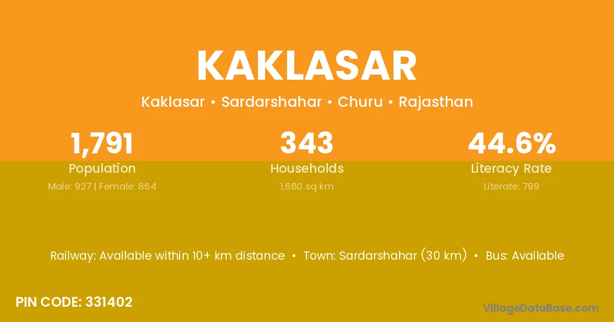 Sardarshahar (30 km) is the nearest town to Kaklasar village for major economic activities and is located approximately 30 km away.