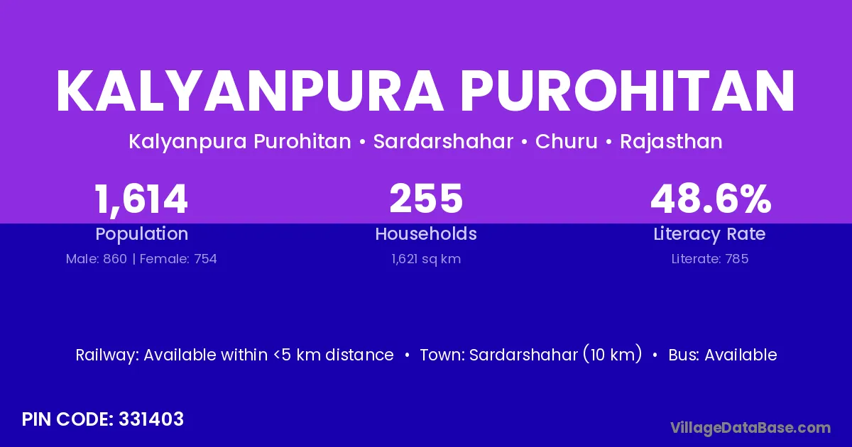 Sardarshahar (10 km) is the nearest town to Kalyanpura Purohitan village for major economic activities and is located approximately 10 km away.