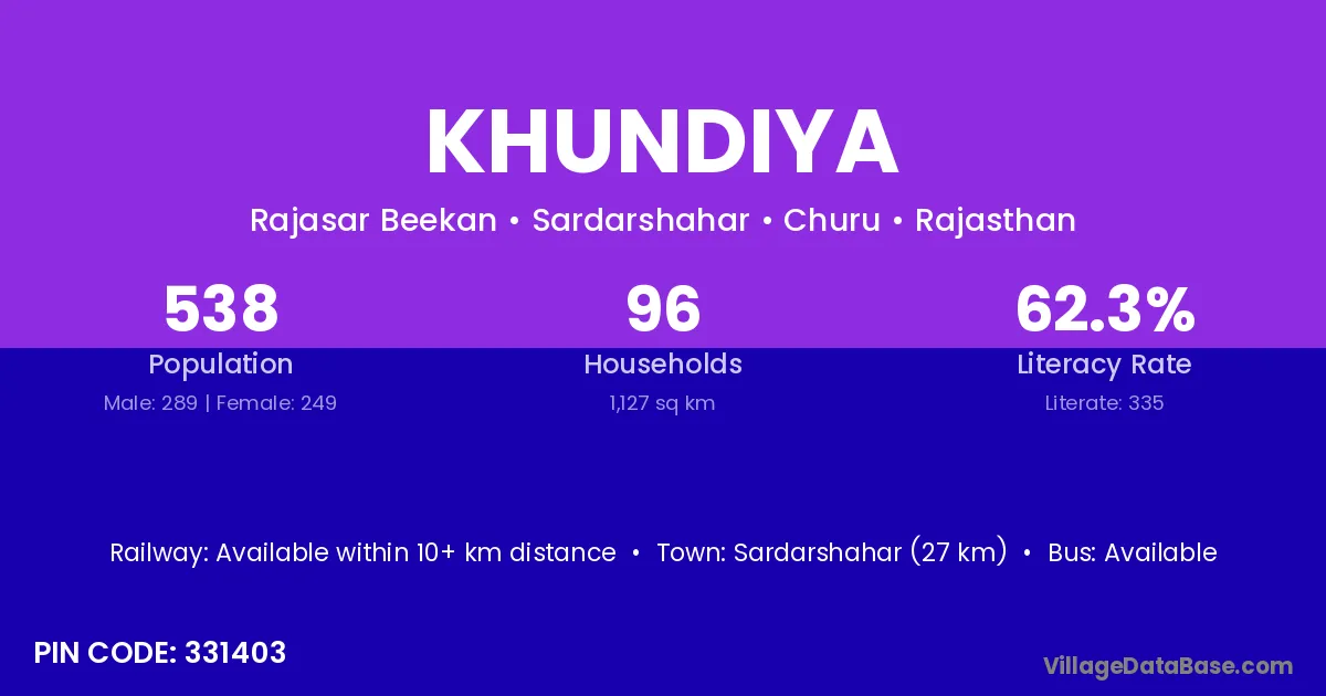 Sardarshahar (27 km) is the nearest town to Khundiya village for major economic activities and is located approximately 27 km away.