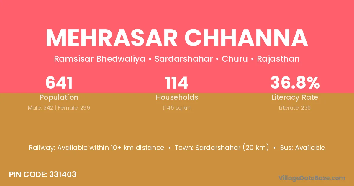 Sardarshahar (20 km) is the nearest town to Mehrasar Chhanna village for major economic activities and is located approximately 20 km away.