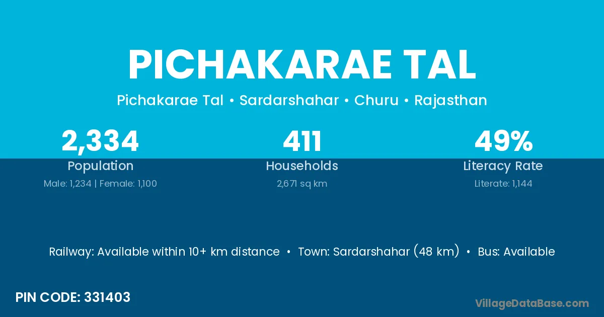 Sardarshahar (48 km) is the nearest town to Pichakarae Tal village for major economic activities and is located approximately 48 km away.