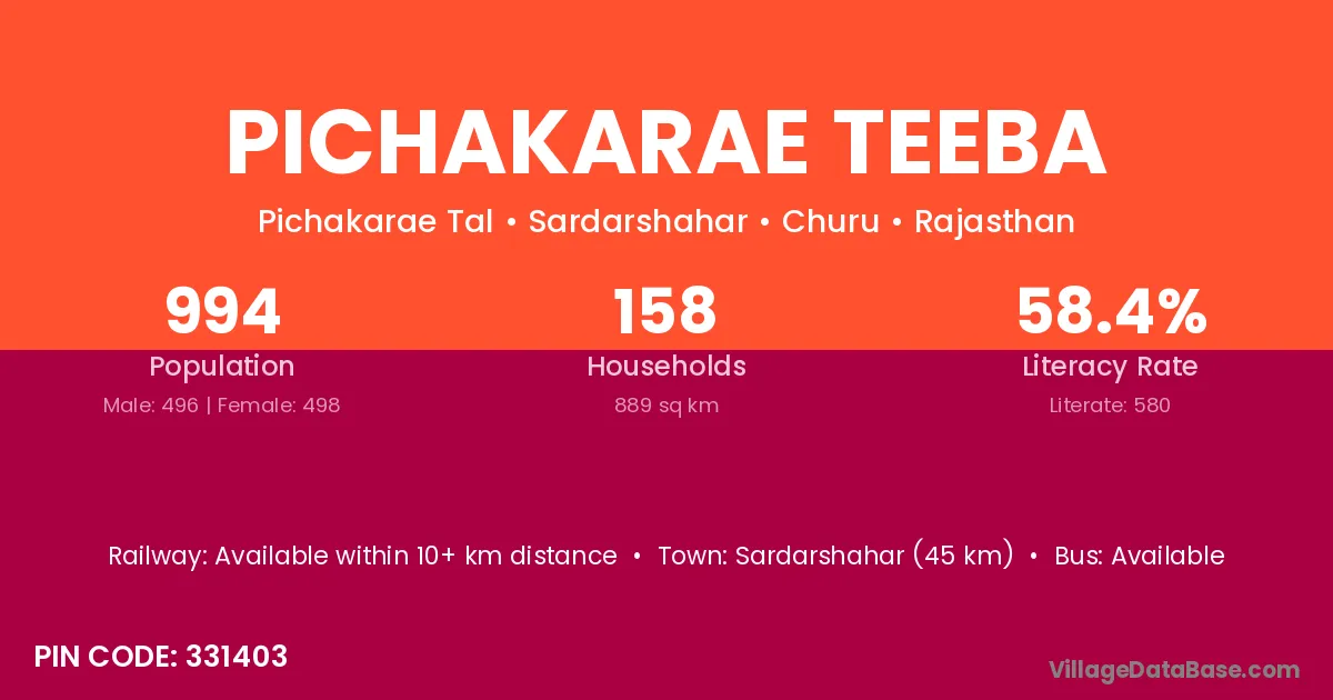 Sardarshahar (45 km) is the nearest town to Pichakarae Teeba village for major economic activities and is located approximately 45 km away.