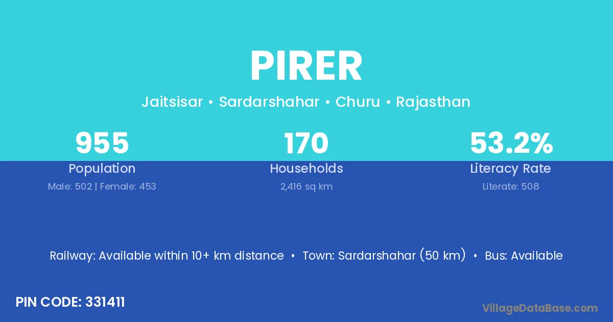 Sardarshahar (50 km) is the nearest town to Pirer village for major economic activities and is located approximately 50 km away.