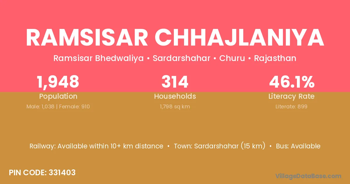 Sardarshahar (15 km) is the nearest town to Ramsisar Chhajlaniya village for major economic activities and is located approximately 15 km away.