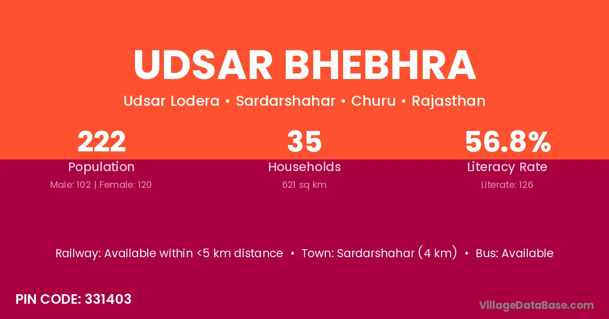 Sardarshahar (4 km) is the nearest town to Udsar Bhebhra village for major economic activities and is located approximately 4 km away.