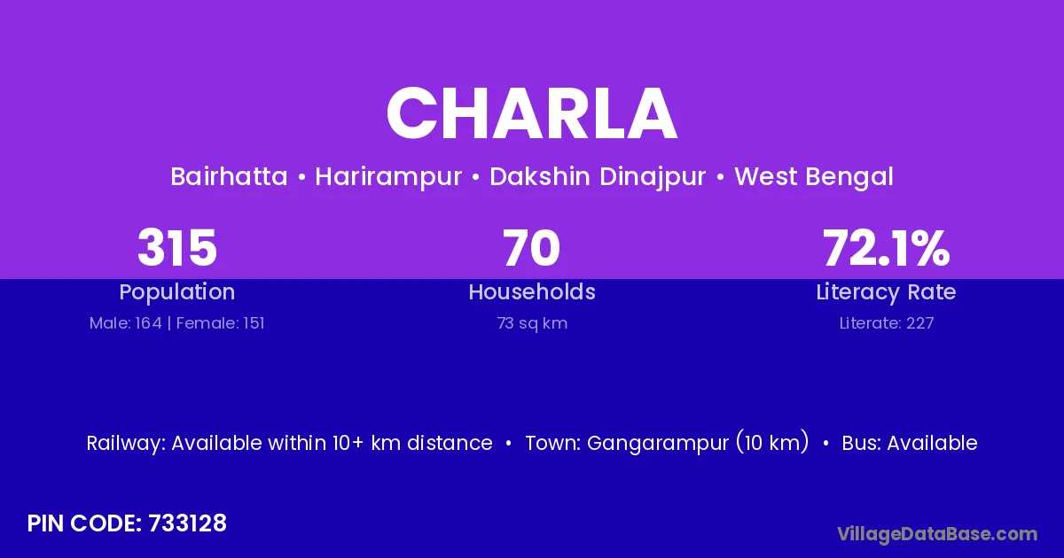 Sujangarh (30 km) is the nearest town to Charla village for major economic activities and is located approximately 30 km away.
