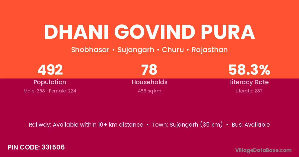 Sujangarh (35 km) is the nearest town to Dhani Govind Pura village for major economic activities and is located approximately 35 km away.