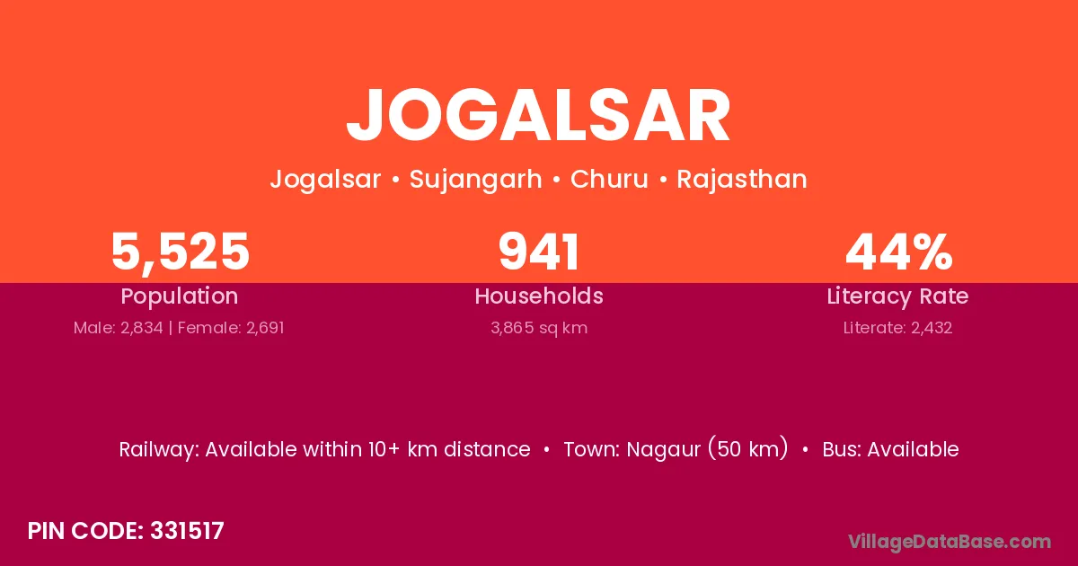 Nagaur (50 km) is the nearest town to Jogalsar village for major economic activities and is located approximately 50 km away.