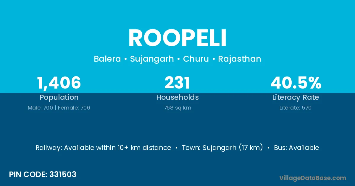 Sujangarh (17 km) is the nearest town to Roopeli village for major economic activities and is located approximately 17 km away.