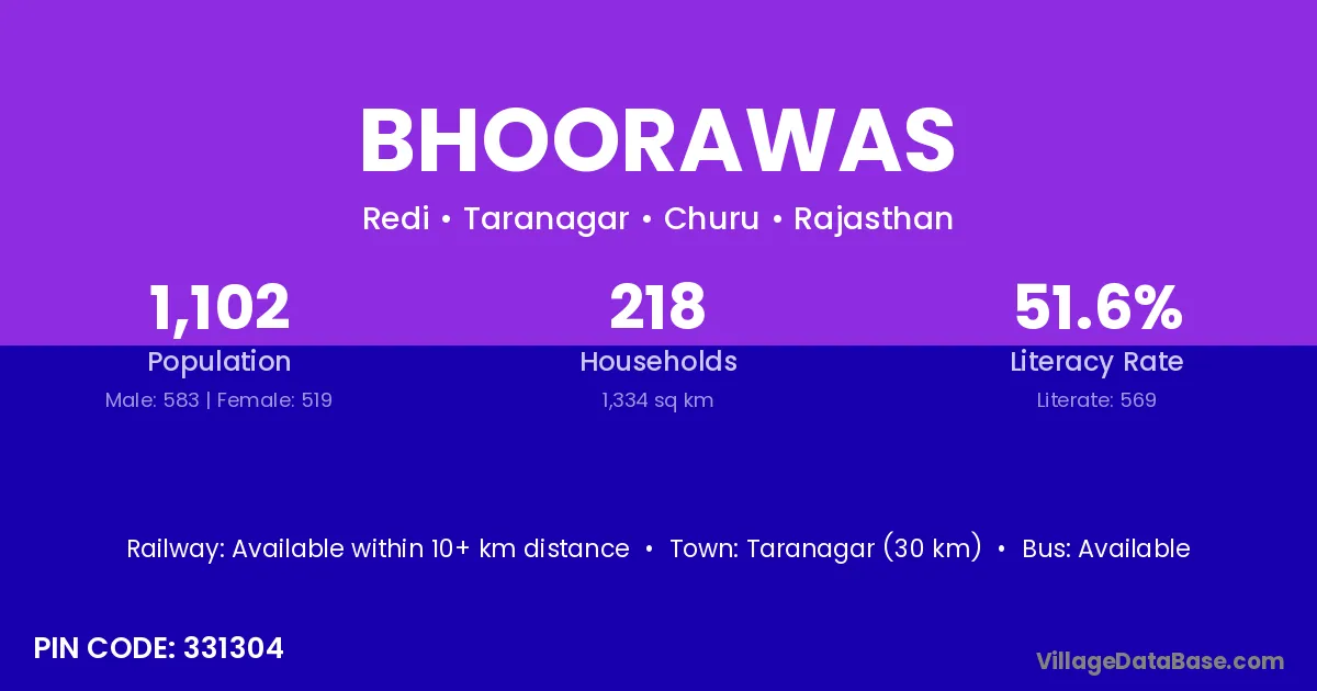 Taranagar (30 km) is the nearest town to Bhoorawas village for major economic activities and is located approximately 30 km away.