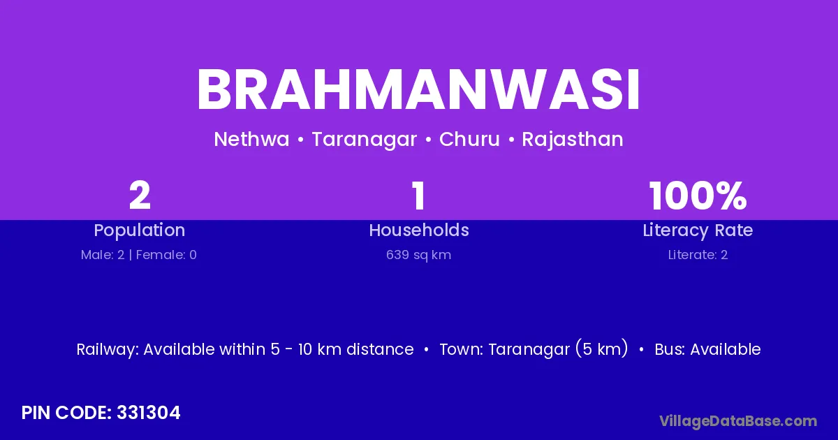 Taranagar (5 km) is the nearest town to Brahmanwasi village for major economic activities and is located approximately 5 km away.